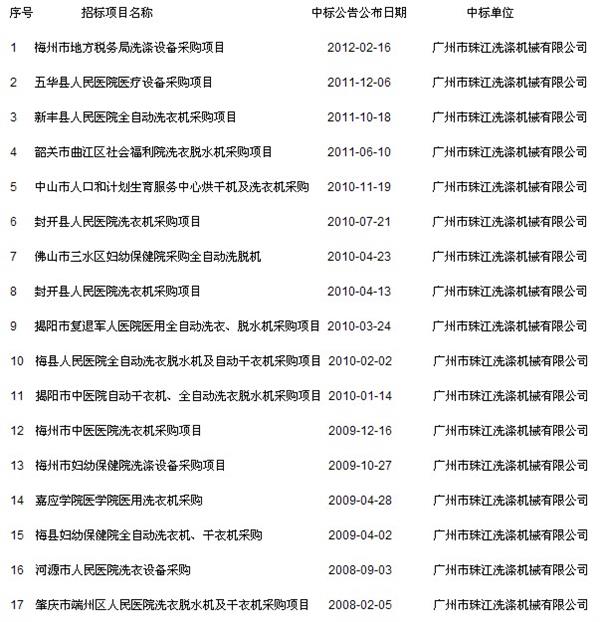 以下為廣東省政府采購網(wǎng)公布的廣州市珠江洗滌機械有限公司中標信息匯總: